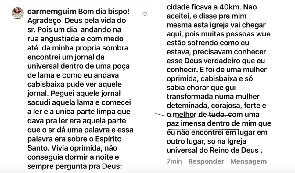 Y de una mujer oprimida, cabizbaja, que solo sabía llorar, fui transformada en una mujer determinada, valiente, fuerte y, lo mejor de todo, con una paz inmensa dentro de mí que no encontré en ningún otro lugar, solo en la Iglesia Universal del Reino de Dios.