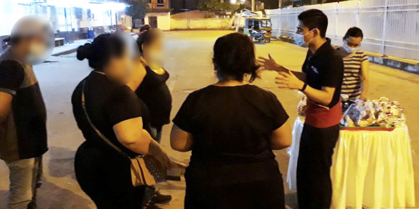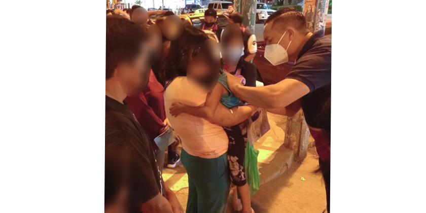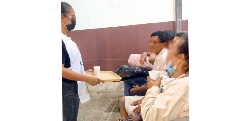 Entregando refrigerios de café y sánduche a las personas que allí se encontraban pernotando hasta recibir información de sus familiares hospitalizados.